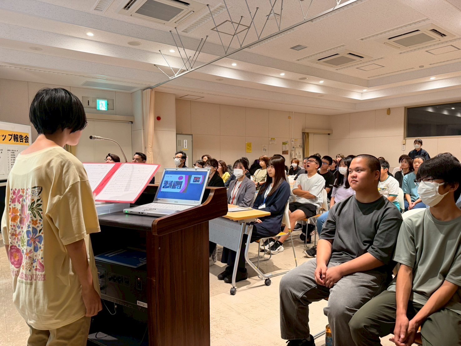 私はインターンシップ報告会に参加するのが二回目になります。去年と比べて二回目の今回が特に緊張しました。なぜかと言うとたくさんのお客様がいたからです。緊張しましたが、最後まで発表することができました。一番目に発表したけど楽しむことができました。