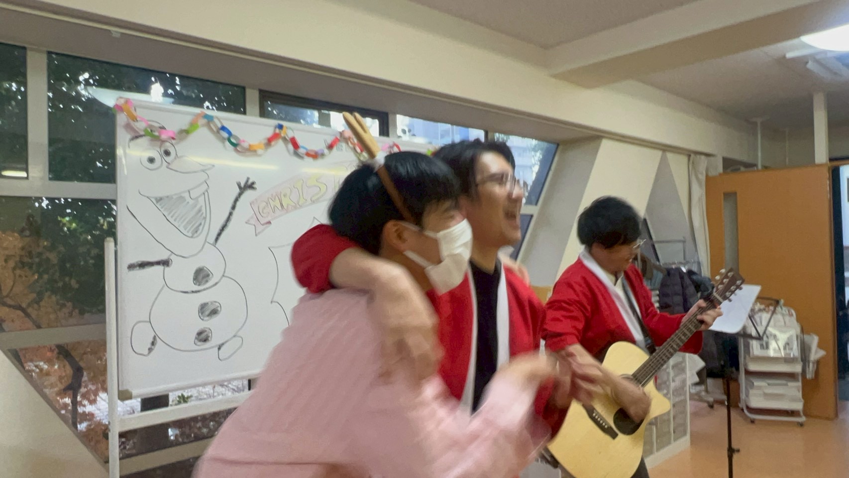では、先生たちが、サンタさんに、変装しました。僕たちは、お客さんとして、盛り上げました。ハピネス、はいよんで、アナ雪を、盛り上げました。